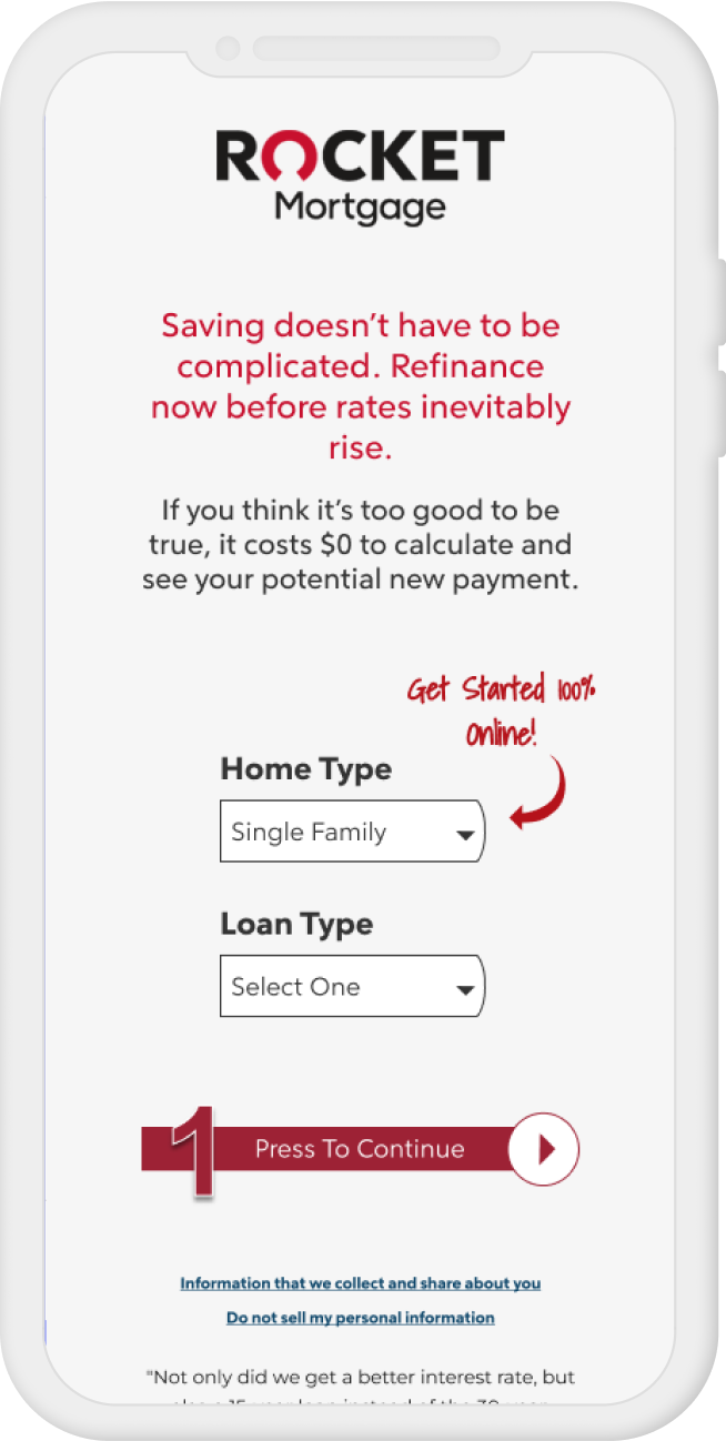 Within Rocket Mortage’s umberella are specialized lead forms with the goal of getting a user to their mortgage’s "finish line” as quickly and easily as possible. These lead forms are managed by my team at Core Digital Media (a Rocket Mortgage subsidiary) where I was tasked to grow them to new heights. This included increasing conversion rate, mortgage application starts, and overall revenue.