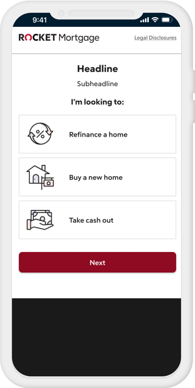 I was tasked with growing Rocket Mortgage’s specialized lead forms with the goal of getting a user to their mortgage’s "finish line” as quickly and seamlessly as possible. This included increasing conversion rate, mortgage application starts, and overall revenue.